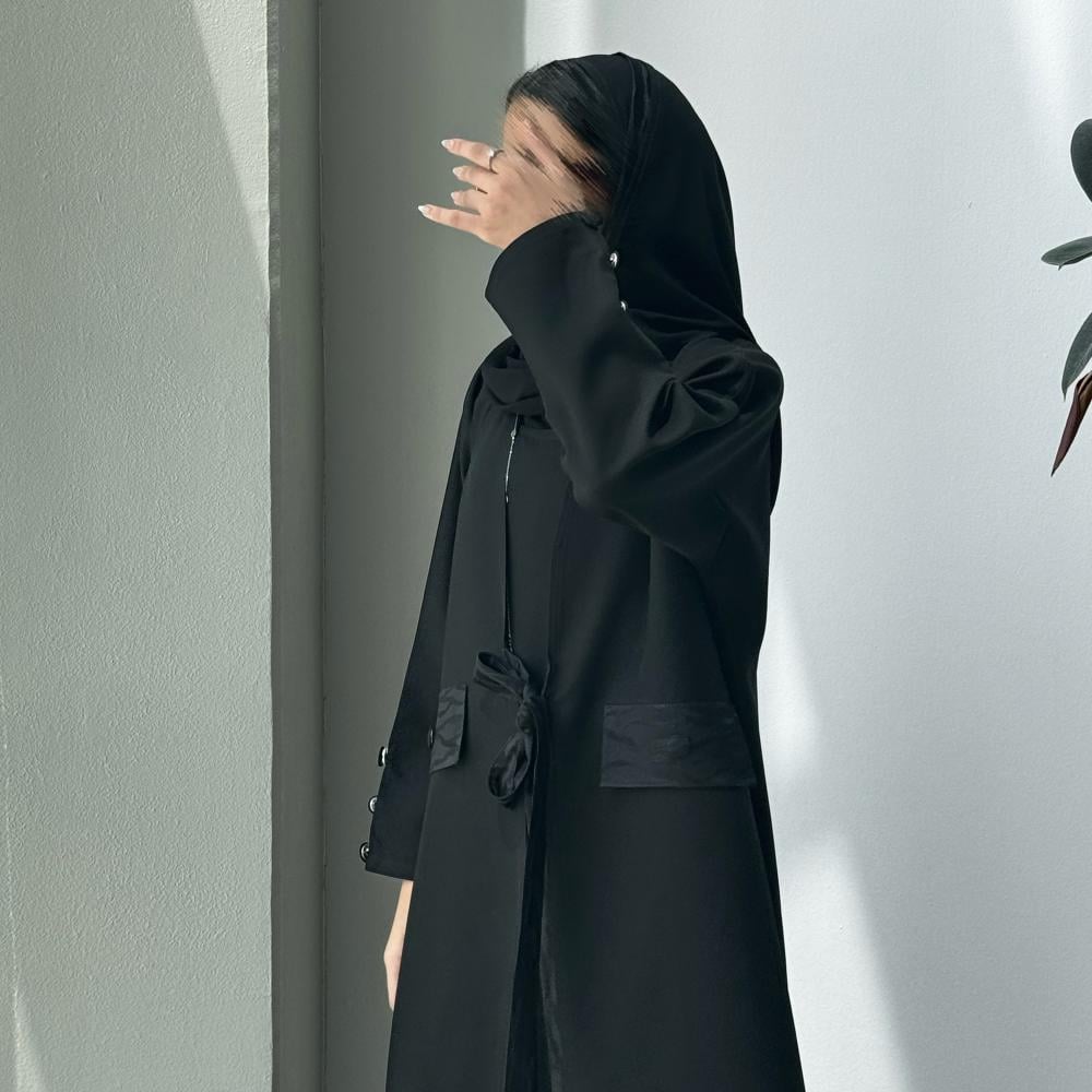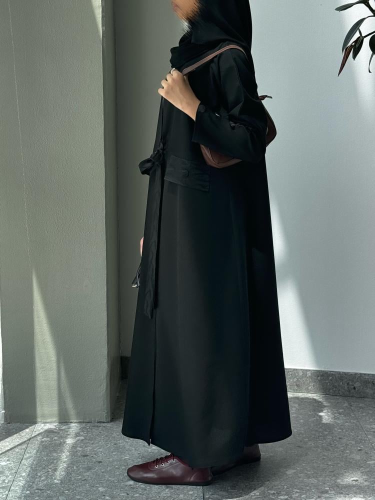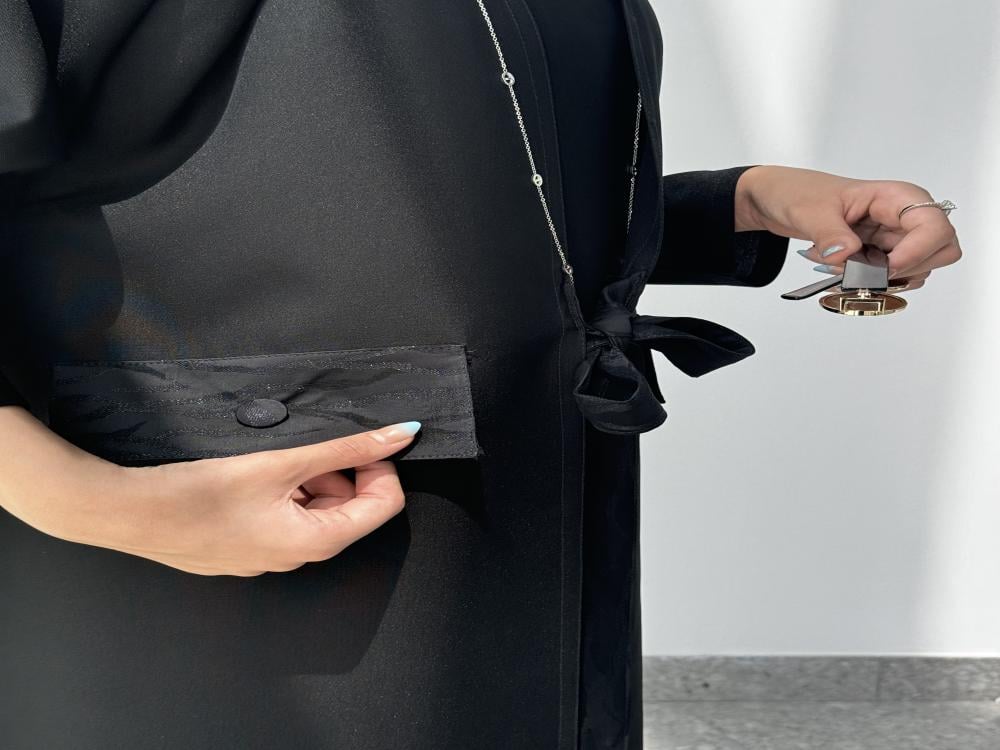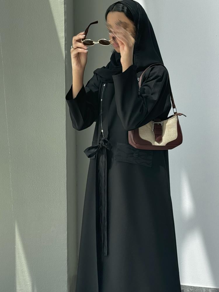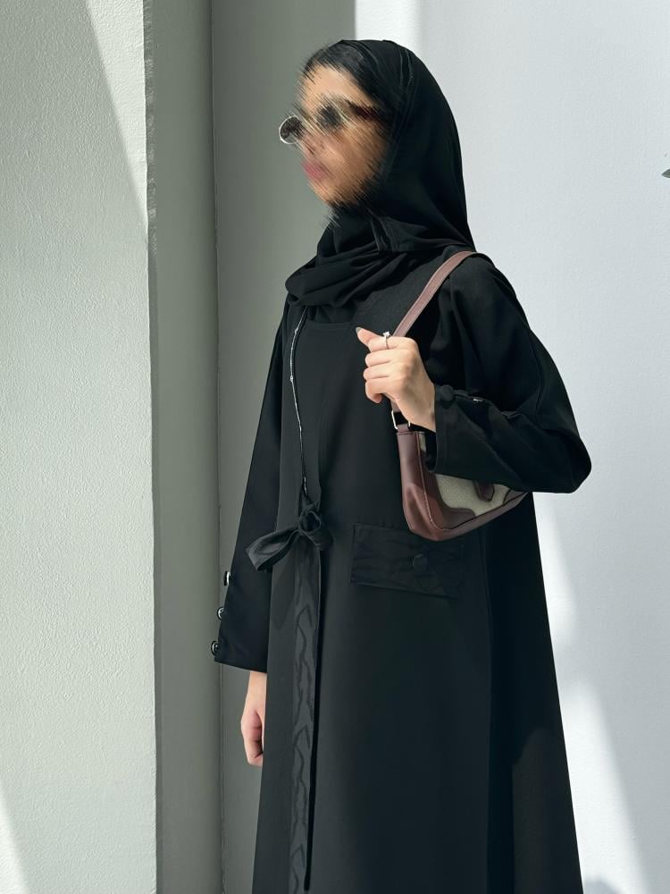 عباية مع فستان داخلي مخيط من جهه والجهه الاخرى طقطق ساترة مناسبة للدوامات والطلعات اليومية ايضا يعطيك مظهر راقي ومرتب مع تدخيلة جاكار وجيوب مخفية
